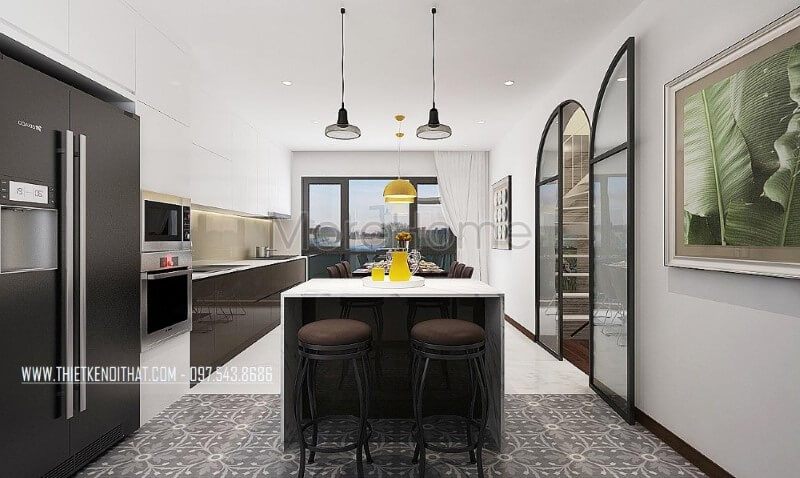 Trong ý tưởng trang trí không gian phòng bếp biệt thự hiện đại, vật liệu ốp bếp rất được chú trọng bởi điều hiển nhiên xảy ra khi nấu nướng sẽ có nhiều vết bắn dầu mỡ nếu không được lau sạch sẽ gây ra ẩm mốc. Khắc phục điều đó, kính ốp bếp hay đá ốp bếp đều là lựa chọn tối ưu, nhưng nếu có điều kiện đá marble đen chỉ trắng như trong mẫu phòng bếp trong đây sẽ là lựa chọn đáng chú ý