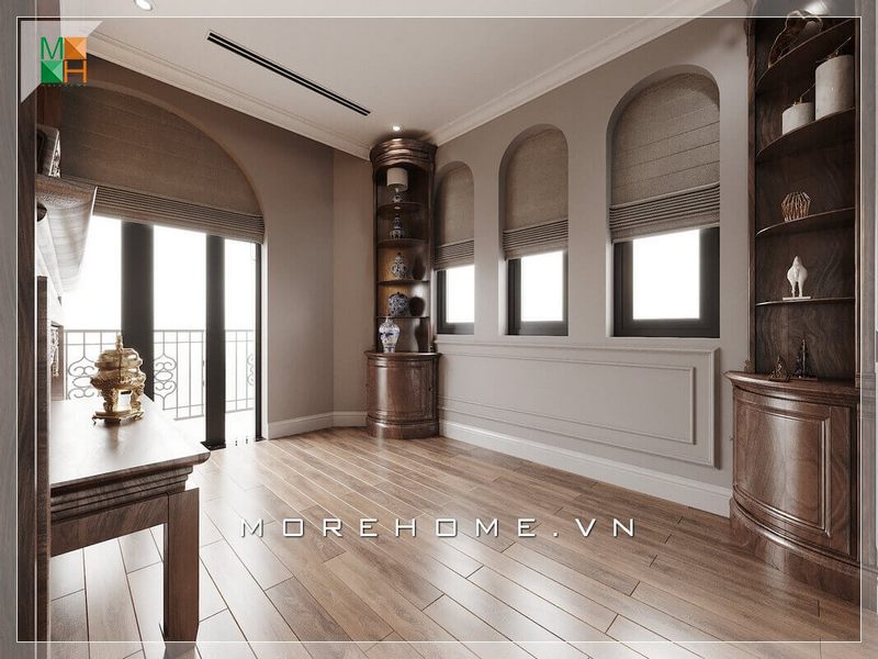 Thiết kế nội thất phòng thờ hiện đại, đẹp từ tủ thờ, vách cnc, gỗ ốp, sàn, ghế gỗ óc chó cao cấp.