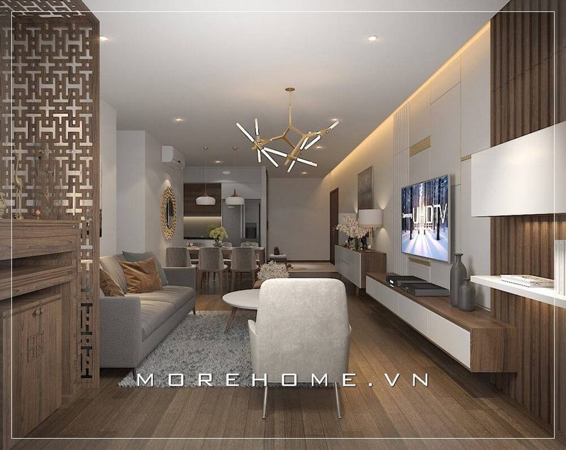 Không gian phòng khách căn hộ thêm tiện nghi, thoáng đãng với tâm điểm là bộ sofa bọc vải sắc xám tinh tế kết hợp chân sắt chắc chắn được thiết kế kiểu dáng văng đôi tiện lợi và phong cách hiện đại trẻ trung.