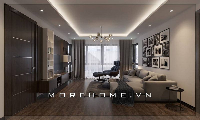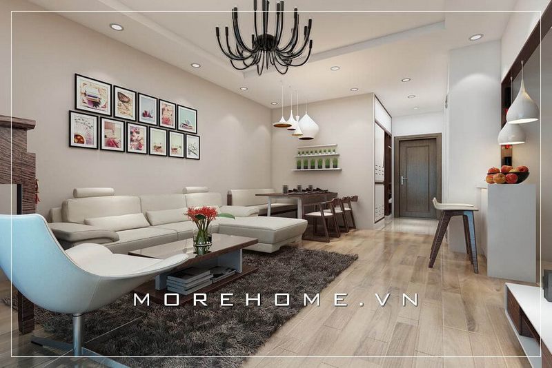 Mang đến mẫu thiết kế phòng khách chung cư đẹp với nội thất hiện đại tông màu trắng xám sang trọng và đẳng cấp được tạo bởi KTS MoreHome