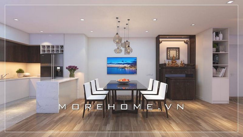. Mẫu thiết kế nội thất chung cư cao cấp này sẽ đưa ra cho bạn một ý tưởng tuyệt vời về cách bố trí nội thất hợp lí, hài hòa với màu sắc tổng thể tạo nên một vẻ đẹp sang trọng và trẻ trung.