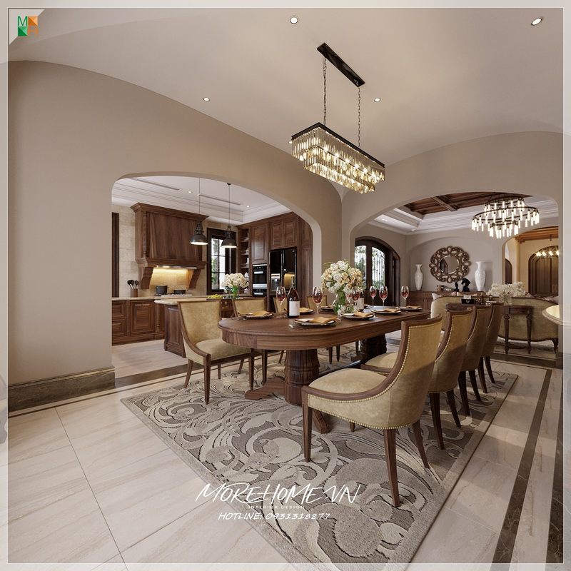 Thiết kế nội thất phòng ăn gỗ sồi cho biệt thự cao cấp tân cổ điển ấn tượng với nét tinh tế, mềm mại mang lại không gian dùng bữa sang trọng phù hợp với phong cách riêng của gia chủ