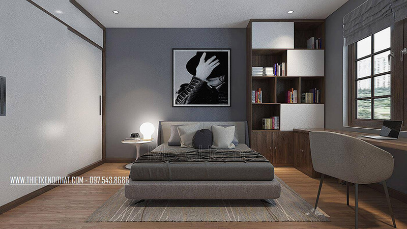 Thiết kế giường ngủ hiện đại, gia chủ lựa chọn gam màu trung tính cùng màu với nội thất khác tạo nên sự sang trọng, liền mạch hơn cho căn phòng