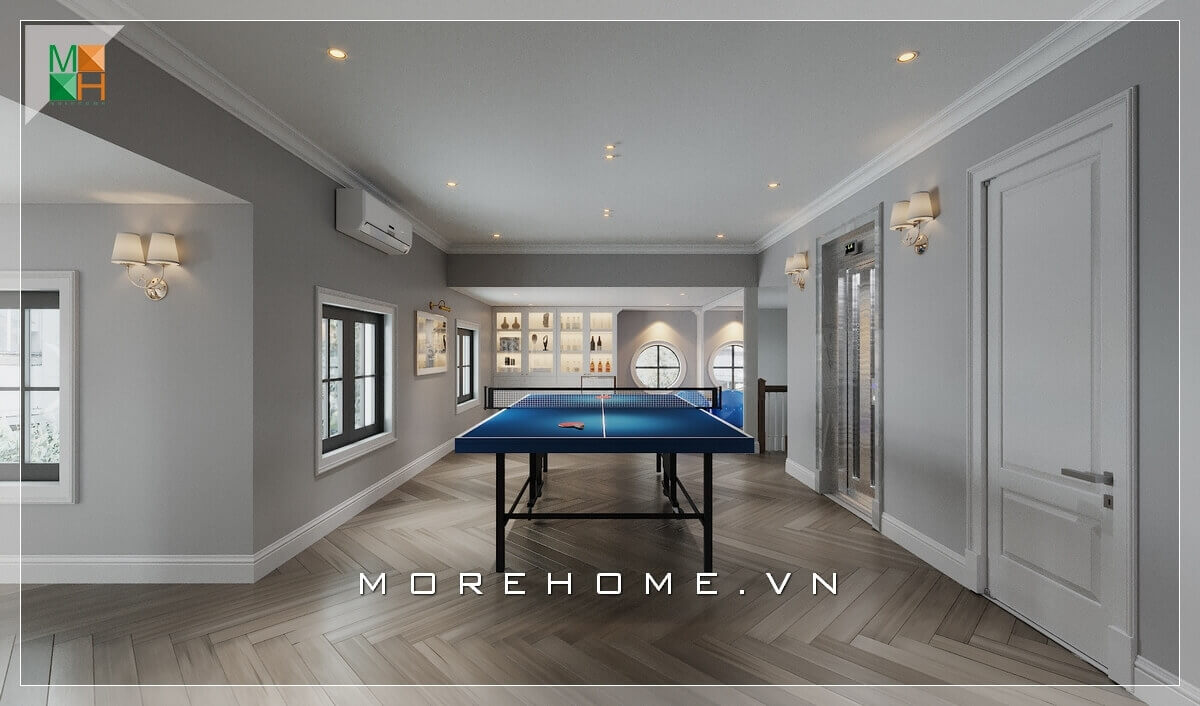 Khu chơi thể thao, tập luyện bóng bàn và các hoạt động thể dục nâng cao sức khỏe được quan tâm bố trí trong một không gian thoáng có nhiều cửa sổ của nhà phố.