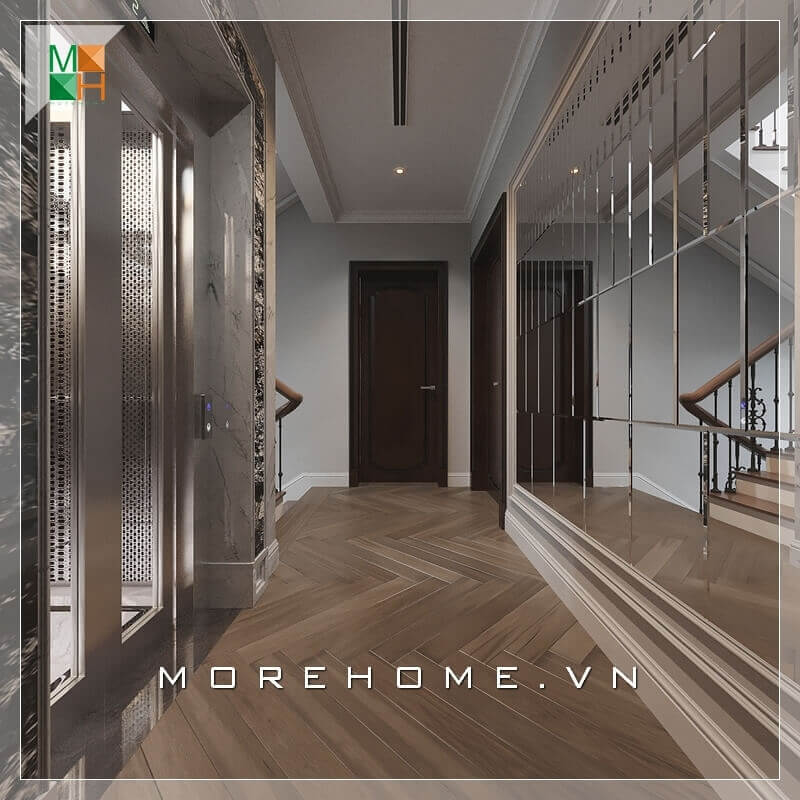 Bố trí tường hành lang gắn gương kính hiện đại tạo cảm giác rộng rãi ấn tượng cho biệt thự, nhà phố