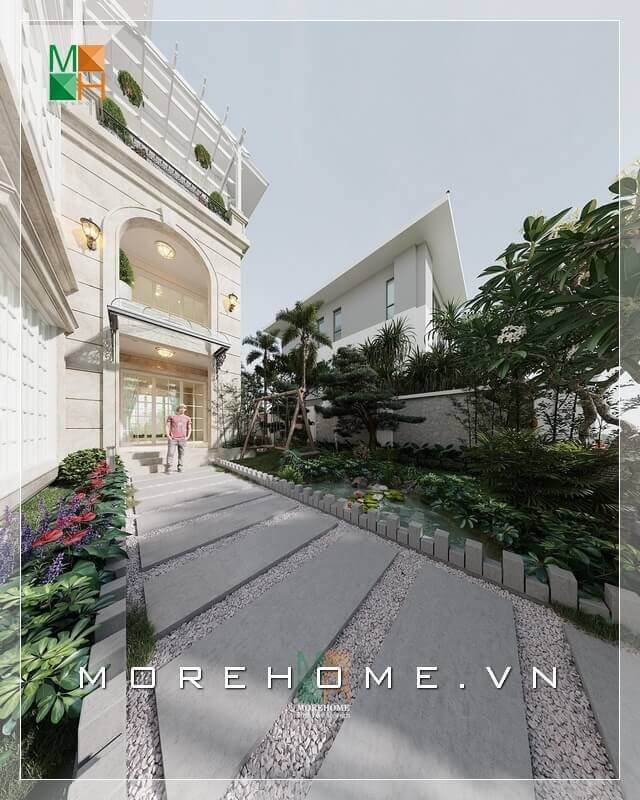 Thiết kế không gian lối đi hông nhà biệt thự đẹp và ấn tượng với hàng cây xanh mát đầy sức sống.